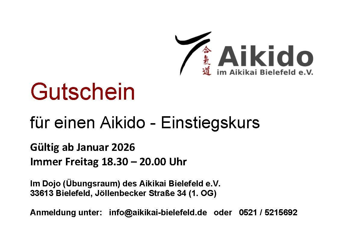 Ab Januar bieten Andrea, Monica und Matthias wieder Einstiegskurse AIKIDO an. In Kleingruppen oder zu zweit oder dritt begleiten wir euch ca. drei bis vier Mal und vermitteln Grundlagen. Ein späterer Einstieg in ein reguläres Training ist Ziel aber nicht Bedingung für diesen Kurs. Vorgesehen ist Freitag 18.30 - 20.00 Uhr. Andere Termine und ein späterer Einstieg sind möglich. Bei Interesse bitte anmelden unter: info@aikikai-bielefeld.de oder 0521 5215692